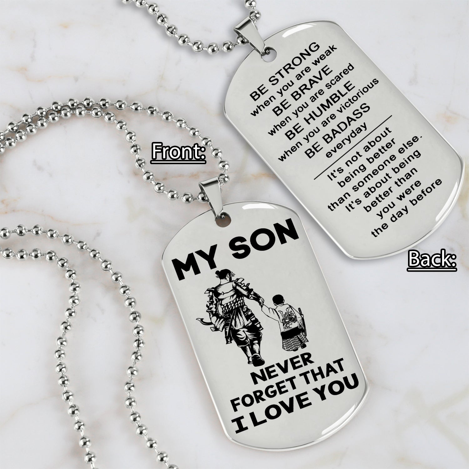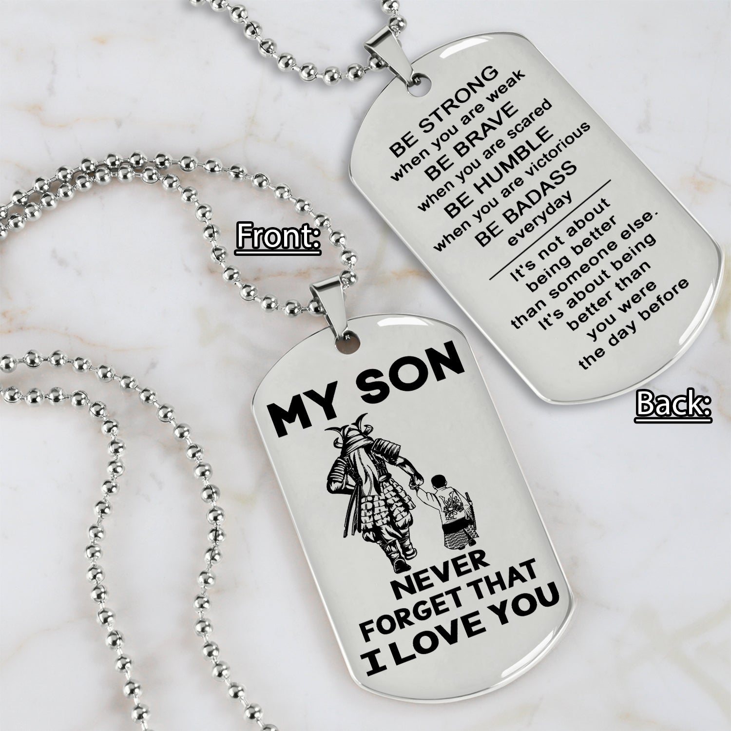 Samurai engraved double sided dog tag dad to son be strong when you are weak